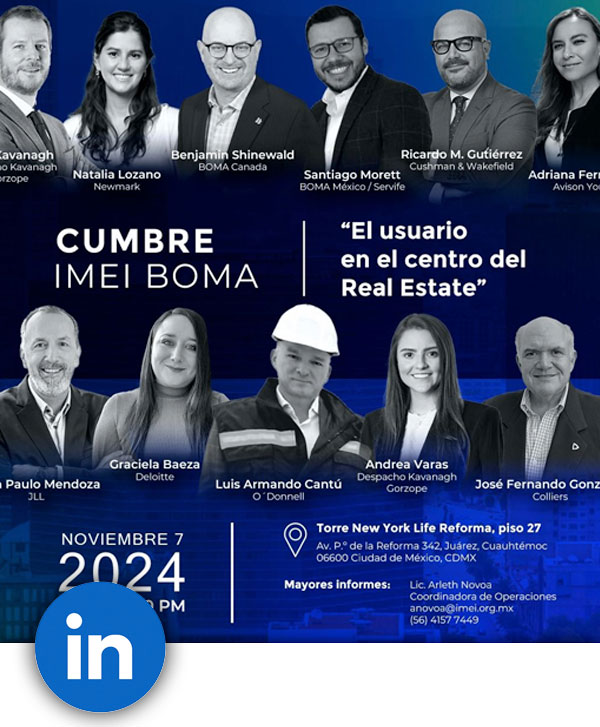 El pasado 7 de noviembre, en el espectacular piso 27 de la Torre New York Life, llevamos a cabo la Cumbre IMEI BOMA 2024, un evento que reunió a expertos, empresas y visionarios del sector inmobiliario para explorar cómo poner al usuario en el centro de los espacios colaborativos, productivos y sostenibles.