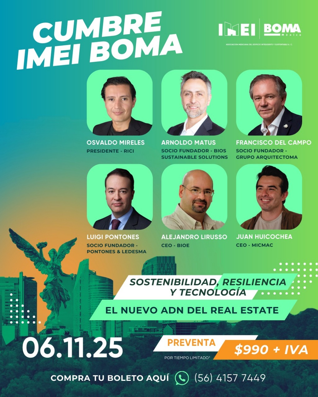 La Cumbre IMEI BOMA 2025 es el encuentro más relevante del año para quienes lideran la transformación del sector inmobiliario hacia la inteligencia, la eficiencia y la sostenibilidad. Un espacio de alto nivel donde convergen profesionales, empresas, desarrolladores, especialistas en tecnología, operación y gestión de edificios.